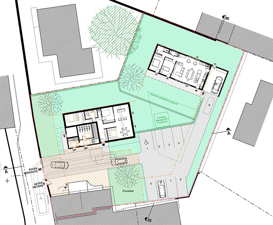 La maison de plain-pied s’implante en fond de parcelle, en cœur d’îlot, pour profiter d’une certaine tranquillité et de l’orientation Sud ; le collectif occupe quant à lui le front de rue dans un contexte plus urbain ; un bâtiment existant en limite Sud actuellement destiné à la location doit être conservé dans un premier temps ; des espaces partagés végétalisés et arborés agrémentent et articulent l’ensemble.