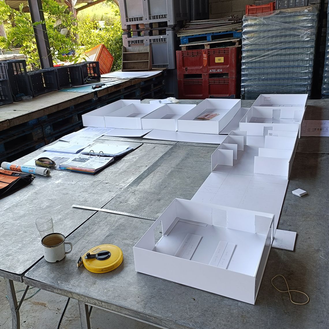 Réunion de travail in situ avec l’ergonome et sa maquette au 1/24° (échelle Playmobil) pour vérifier l’organisation intérieure des espaces arrêtée en programme et développée en esquisse.