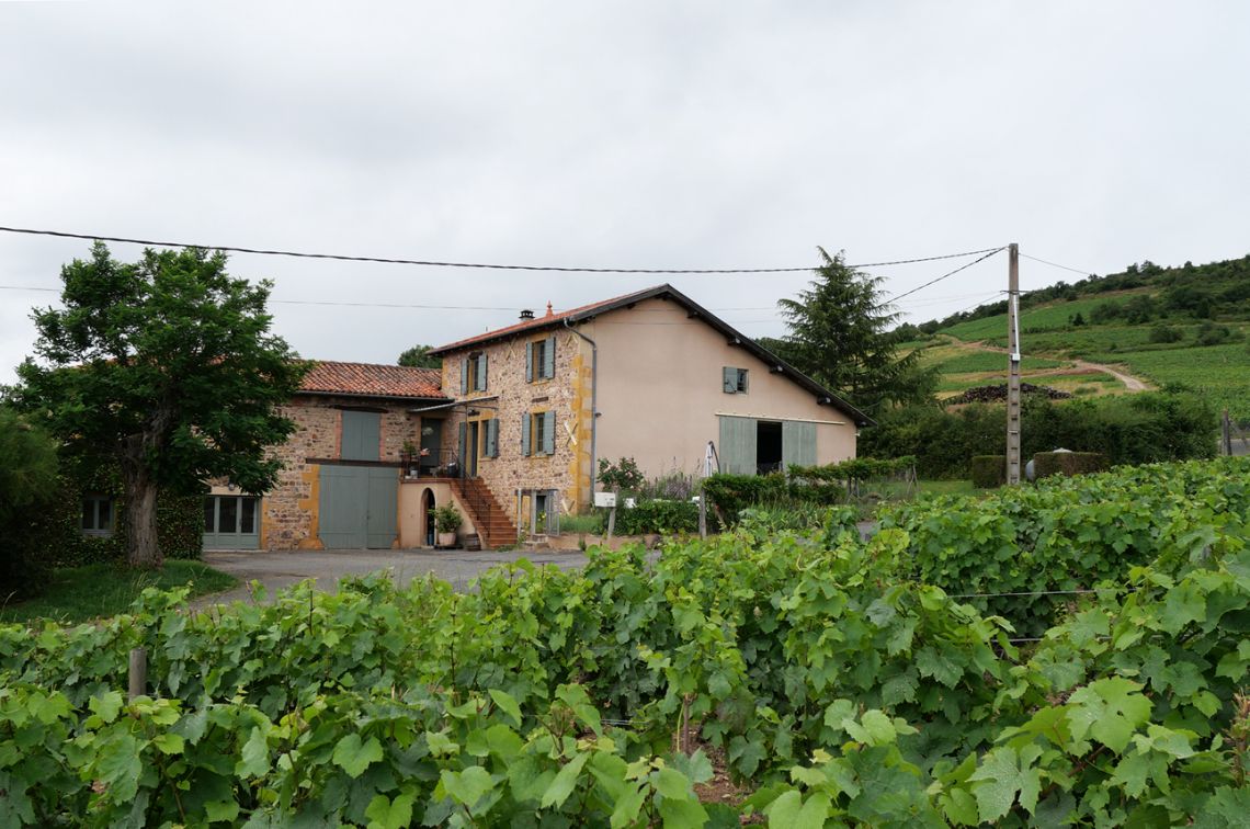 Les pierres sont dites « dorées » à cause du calcaire jaune local, le pisé est utilisé intelligemment pour les murs de refend intérieurs, et avec le bois de charpente en chêne, ce sont les trois matériaux qui ont servis à l’édification de cette ancienne ferme de polyculture typique du Beaujolais de la fin du XIX° siècle.