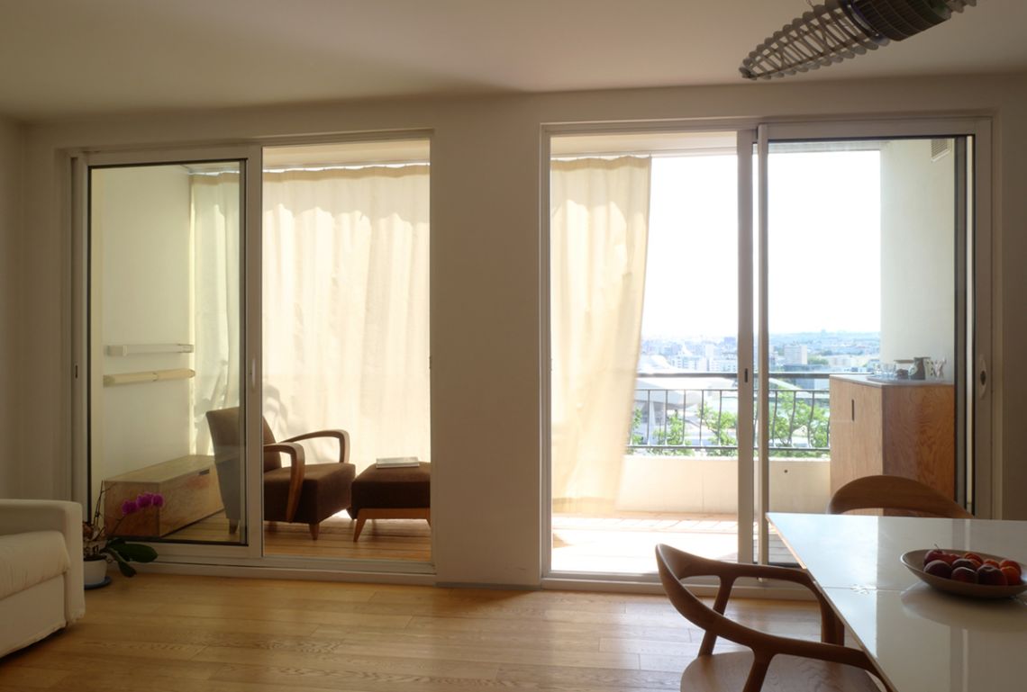 Pour améliorer le confort d’été de cet appartement rénové il y a quelques années, un rideau coulissant est installé à l’extérieur du balcon permettant le contrôle du rayonnement solaire sur les châssis vitrés et une appropriation autre de cet espace intermédiaire ainsi créé. Fermé, il se niche dans la profondeur du balcon grâce à un rail cintré.