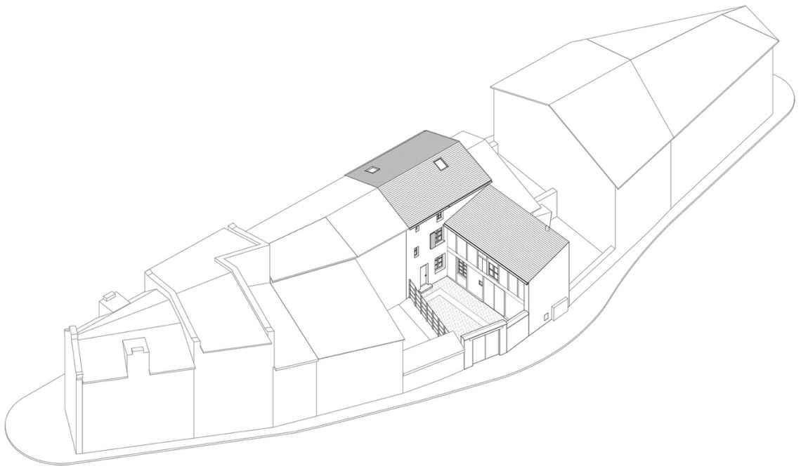 Entre ciel et terre, nous sommes invités à imaginer de nouveaux espaces à vivre sous le toit protecteur d’une maison familiale de centre bourg.