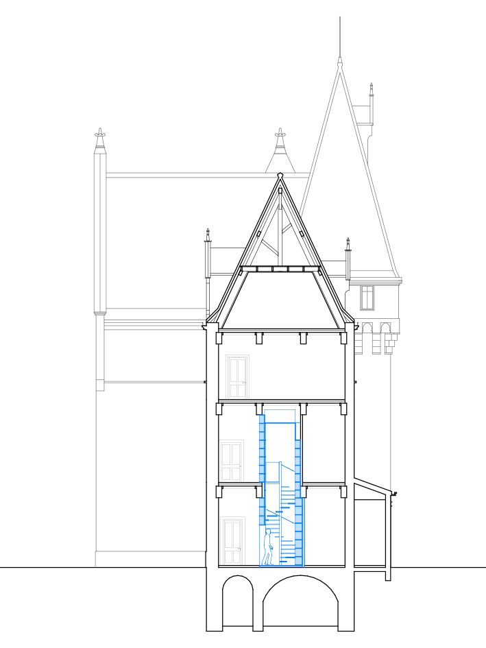 Un projet d’escalier associé à une bibliothèque doit permettre de desservir les deux niveaux d'un duplex de ce majestueux château du début du XVIIIe siècle, remanié fin XIXe et aujourd’hui divisé en copropriété.